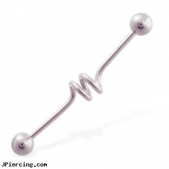 Industrial straight barbell with swirled  center, 14 ga, industrial barbells, industrial piercing prices, industrial steel body jewellery, straight barbell clear retainer, straight pin nose rings