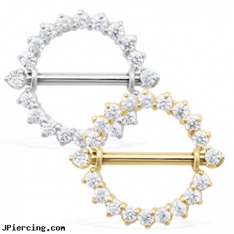 Gauge (Thickness): 14 (1.6mm) Ball size: 5/32" (4mm) Material: cubic zirconia Material: 14K yellow gold Type: nipple ring Inside diameter: 5/8" (16mm) -: priced and sold individually -: barbell included Gem Type: CZ Threading Type: Externally Threaded Gem Setting: Prong Set Gem Creation: Synthetic Gem Shape: Round Gem Color: Clear