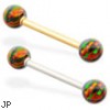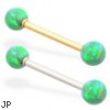 The tongue piercing, consists of a barbell through the center of the tongue. To avoid damaging the nervous system, tongue rings are generally placed vertically at the center of the tongue, in front of the "webbing" or lingual frenulum which attaches the tongue to the bottom of the mouth. Alternately, pairs of "snake bite" piercings could be done on either side of center, giving the appearance of fangs. Tongues are often very easy to stretch, so enlarging the hole is also an option after healing. Like with any stretching, this should be done gradually - no faster than one size in 2 months.
